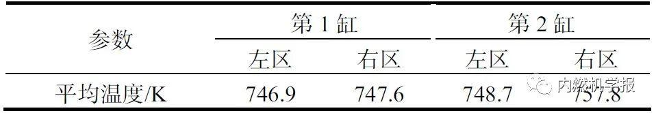 图5为第1缸和第2缸在点火时刻附近的测点温度分布。第1缸的8个测点温度均低于第2缸,且第1缸左、右区温差较小。结合图2、表1和图4可知,第1缸通过降低缸盖和缸套壁面温度,整体降低了缸内混合气的温度,且第1缸的冷端壁面温度有助于弥补右区燃油吸热效应的不足,最终实现第1缸缸内整体温度降低并分布均匀。