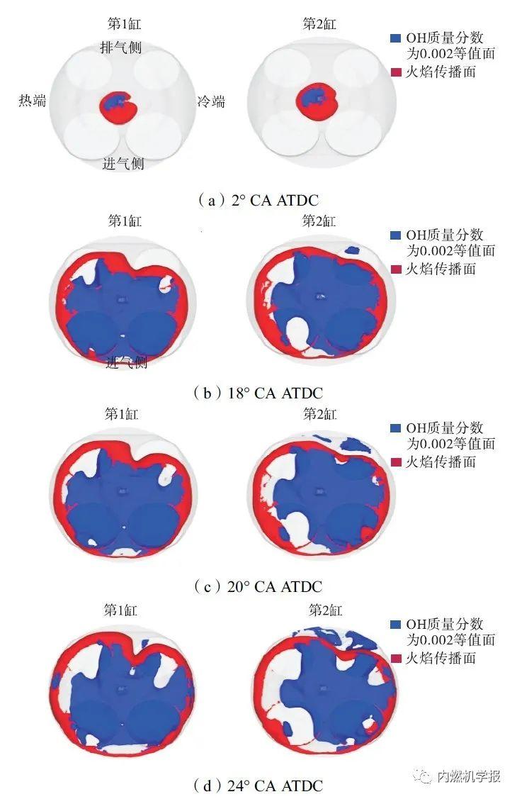 OH自由基可以作为低温化学反应向高温化学反应过渡的示踪组分。当火焰面外围区域OH质量分数超过0.002 时,混合气发生自着火现象。图6为第1缸、第2缸火焰面和OH质量分数分布,其中红色表示火焰传播面,蓝色表示质量分数为0.002的OH等值面。在火焰传播初期(2° CA ATDC),第2缸火焰面范围大于第1缸,此时第2缸火焰传播速度较快。在火焰传播中期( 18 ° CA ATDC),第1缸和第2缸缸内火焰面范围继续扩大,进气侧火焰面范围大于排气侧,火焰面朝进气侧传播速度较快。第2缸末端混合气在介于测点5和测点6中间区域(靠近测点5)出现OH自由基,末端混合气发生自燃现象。结合图4可知,介于测点5和测点6中间区域(靠近测点5)先发生自燃,对应图4a在点火时温度为850 K附近、燃油浓度偏稀区域。而介于测点6和测点7中间区域未出现OH自由基,该区域混合气主要被火焰面覆盖,对应图4b在点火时相对低温(800 K附近)、过量空气系数在1附近。末端混合气在相对高温且燃油浓度偏稀区域容易发生自燃;末端混合气过量空气系数在1附近时,火焰传播迅速消耗掉末端可燃混合气。在20° CA ATDC时,第1缸和第2缸缸内火焰面范围继续扩大,第2 缸OH自由基范围继续扩大,末端混合气自燃程度加强,爆震强度加大。24° CA ATDC时,第1缸在介于测点5和测点6中间区域出现少量OH自由基,末端混合气自燃程度低于第2缸。点火之后,在火焰传播过程中,第2缸火焰面范围均大于第1缸,因而第2缸火焰传播速度比第1 缸快。第2缸出现OH自由基时刻早于第1 缸,且其范围也大于第1 缸,第2 缸末端混合气的爆震强度大于第1缸。