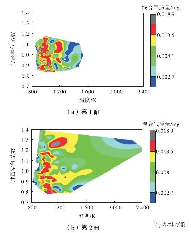 图7为第1缸和第2缸在18° CA ATDC 时末端所有混合气处于不同温度和过量空气系数分区内的混合气质量分布。化学反应中间产物OH 自由基可作为低温化学反应向高温化学反应过渡的示踪组分。在温度分布上,第1缸的末端混合气温度介于800~1 500 K 之间,而第2缸的末端混合气温度介于800~2 400 K 之间。结合图6可知,火花塞点火产生的主火焰传播持续放热,末端混合气受到压缩和热辐射,温度逐渐上升,燃前化学反应加速。第2缸火焰传播范围更大,末端混合气产生自燃现象,末端混合气的高温区域范围较大。在过量空气系数分布上,第1 缸介于0.85~1.20之间,第2缸介于0.80~1.40之间。第1缸的缸内油、气混合均匀性较好。综合温度和过量空气系数分布,在点火时刻附近(图4),介于测点5 和测点6 中间区域(过量空气系数在1.25附近),对应图7 中过量空气系数在1.20~1.30之间的燃油浓度偏稀区域,其温度超过2 000 K,发生末端混合气自燃现象(图6中OH等值面)。末端混合气在高温、燃油浓度偏稀区域更容易发生自燃现象。