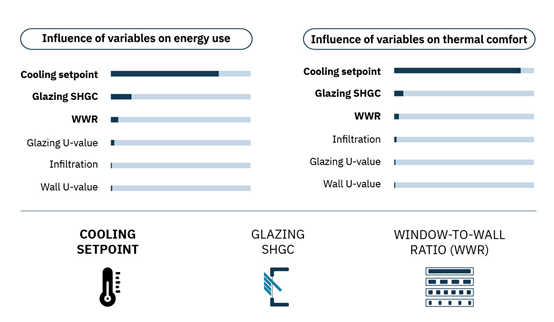 敏感性分析表明,冷却设定点的影响最大,其次是 SHGC(太阳能热增益系数)和窗壁比 (WWR)。玻璃 U 值、渗透率和墙壁 U 值对这些目标的影响最小。在调查可能对冷却、照明、加热能量负载和立面方向产生矛盾影响的建筑参数的影响时,这些假设使优化策略更加有效。