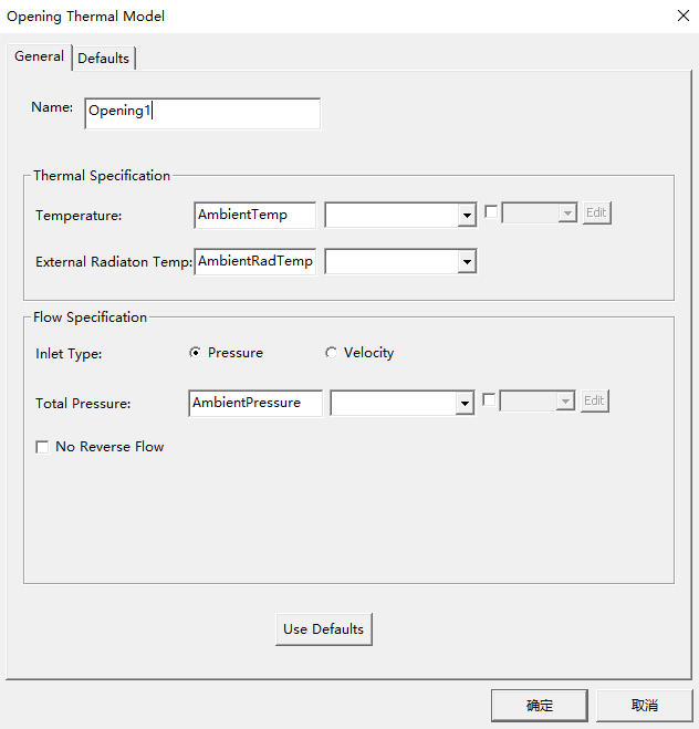 4、选中air region的6个面,设置边界条件为Opening,Opening属性都设置缺省,空气温度无压力穿越边界;