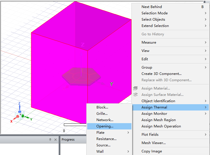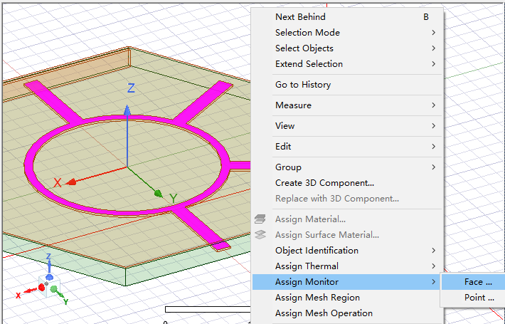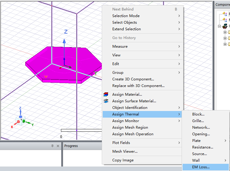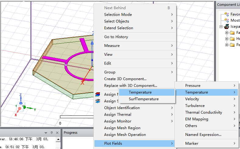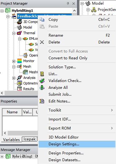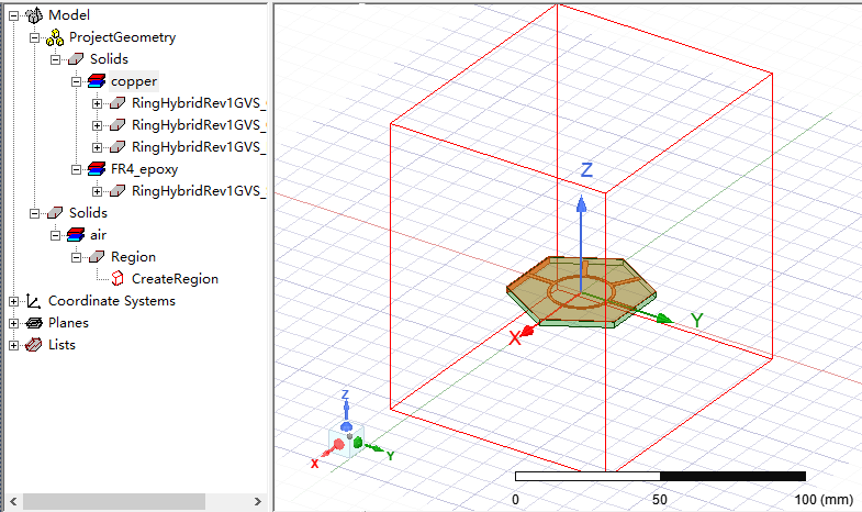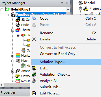 2、回到HFSS项目,选中Hybrid Ring模型,复 制粘贴到Icepak项目中,相应的几何模型及材料属性都被传递到Icepak中,我们可手动检查材料属性是否勾选了热参数选项;