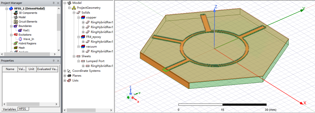 1、打开ANSYS Electronics Desktop,建立HFSS project,根据Hybrid Ring几何参数进行建模;