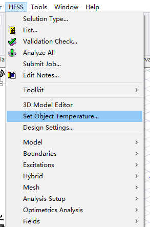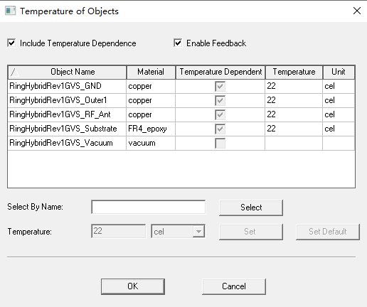 3、在HFSS菜单页点击Set Object Temperature,在弹出的菜单中勾选Include Temperature Dependence和Enable Feedback选项,初始温度为常温22摄氏度,可手动更改;