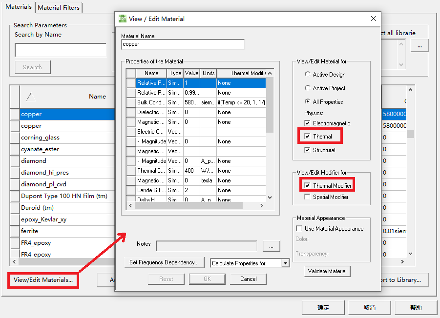 2、由于要进行电热耦合多物理场分析,在HFSS中设置材料属性时,一定要勾选热相关的材料属性设置项,必要时可自行手动设置材料随温度变化的电热参数属性值;