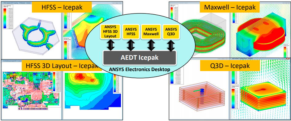 Ansys仿真的一大优势在于多物理场协同仿真,Ansys已在电子桌面中集成HFSS、Maxwell、Q3D等电磁场工具和Icepak热仿真工具,用户可以非常方便的将电磁场工具中的模型、材料参数以及电磁损耗仿真结果传递到Icepak中进行热建模和仿真,并能返回给电磁场工具实现温升对电磁场性能的影响评估,实现电热双向耦合分析。