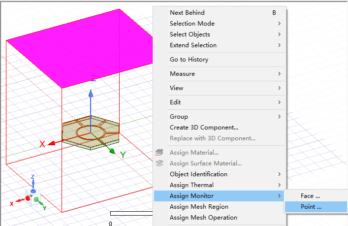 12、设置监控点辅助收敛判断,选择air region上表面中心点和ring的上表面作为监控点;