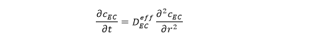 EC为了参与SEI膜的反应,需要穿过SEI膜到达反应界面。为了描述EC在活性颗粒物径向方向的浓度分布,需要描述EC浓度的扩散方程,如下式所示