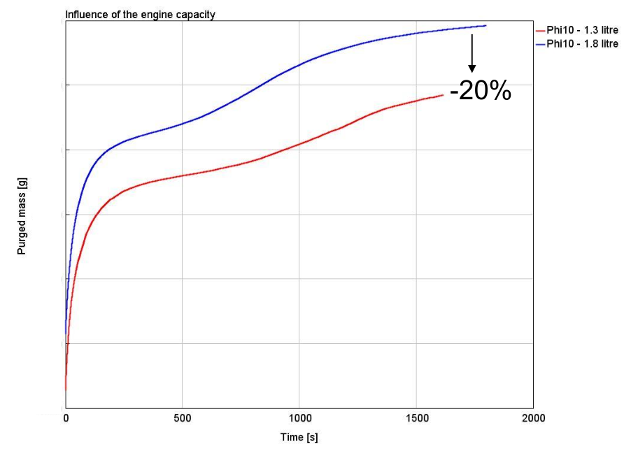 发动机排量对燃油蒸汽清除量的影响:对比1.3L发动机排量和1.8L发动机排量,随着发动机排量的增加,发动机负荷下降,进气系统压力降低,可以看到燃油蒸汽的清除量可以提高20%。
