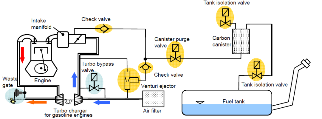 油箱中的燃油蒸汽会产生油箱碳氢排放,炭罐系统在发动机停机时吸收油箱中的燃油蒸汽,在发动机运行阶段,发动机进气系统通过负压将炭罐中附着的燃油蒸汽引入发动机气缸,并燃烧。在增压发动机中,由于发动机进气系统压力较高,对炭罐系统的设计带来了一定的压力。