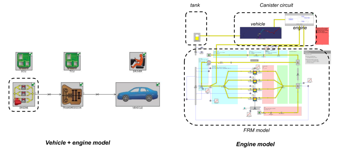 搭建完整的整车炭罐系统模型,包括车辆传动系统,发动机和炭罐系统。其中,发动机使用Fast Running Model进行建模,可以计算在不同车辆行驶工况下发动机进气系统的压力。