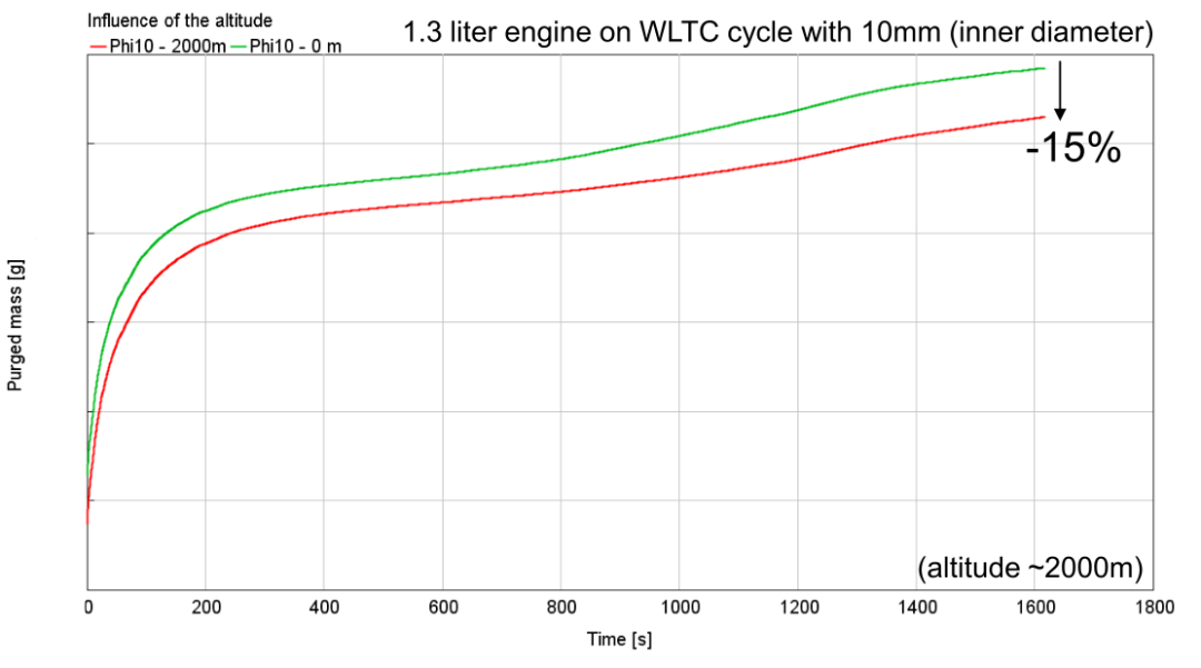 高原环境对燃油蒸汽清除量的影响:当海拔增加至2000m,随着环境压力的下降,需要发动机提高增压度来满足WLTC循环车速要求,因此进气压力增高,燃油蒸汽的清除量下降,下降幅度约为15%。