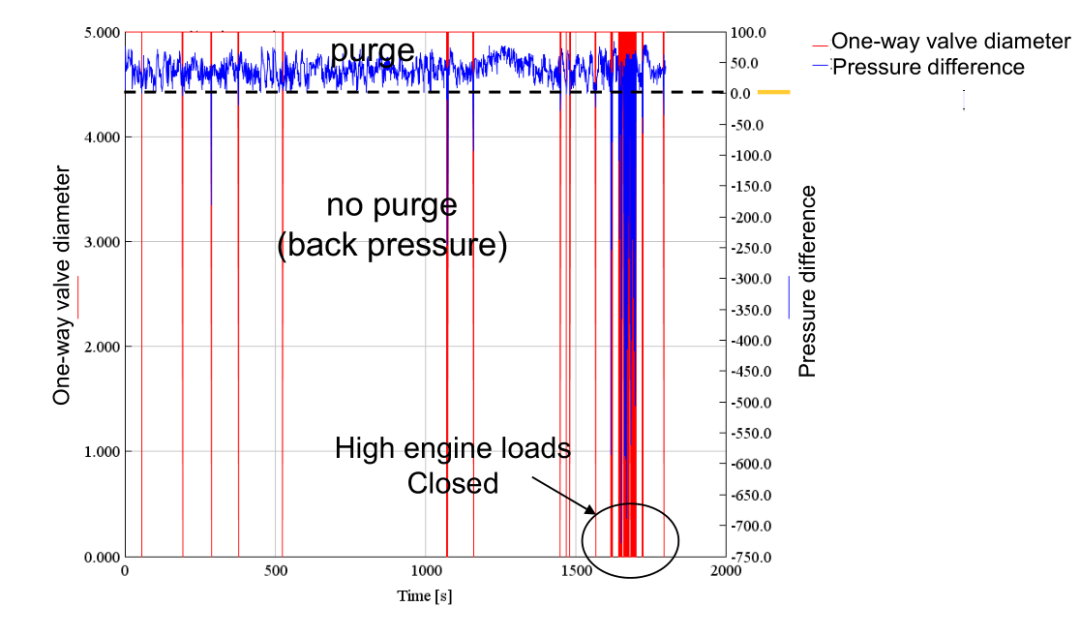 在WLTC工况下,对炭罐系统模拟,监测在WLTC工况下的单向阀进出口压差和单向阀孔径,从计算结果里可以看出,在发动机高负荷区域,由于进气负压减小,单向阀无法开启。