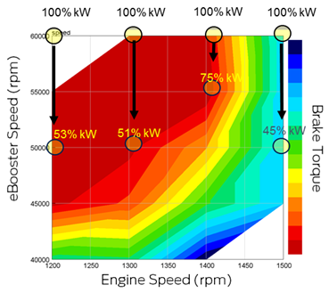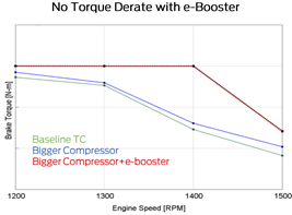 •通过优化压气机匹配,E-Booster可避免高海拔地区扭矩衰减现象的出现,而通过GT-SUITE中的DOE可优化E-Booster转速和耗能的平衡
