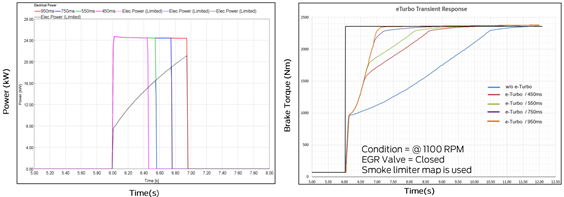 •1100rpm发动机转速、E-Turbo 950ms的辅助工况下,发动机的瞬态响应可提升近3.75s
