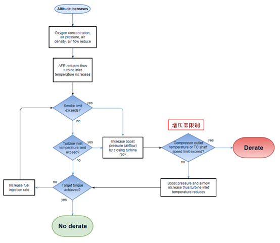 •海拔升高,氧浓度、空气密度、大气压力等边界参数下移,易触发烟度限制,为改善排放,需提高进气增压比