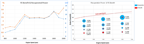 •1200-1700rpm全负荷工况下,E-Turbo系统的介入可回收最高12kW的废气能量,进而降低2.5%的FE