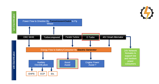 E-Turbo介入可同时提升涡轮机和压气机的效率,而效率的提升也利于回收更多的废气能量,如下图所示。