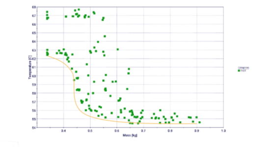在modeFRONTIER中使用FAST(含响应面算法的快速优化算法)算法进行优化,最终得到的优化结果如下图(含Pareto前沿线):