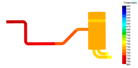 在GT模型中含有5个消声器内腔,每个都具有不同的气体和壁温。使用GT求解器计算出气体温度并传递给TAITherm以预测壁面温度。