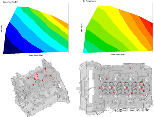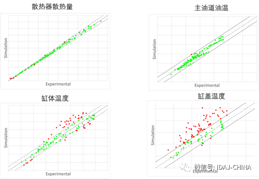 首先进行稳态工况点分析,用于校验热管理系统模型及参数是否合理。用于标定模型的试验参数包括:发动机放热量、润滑油温度、缸体温度、缸盖温度。
