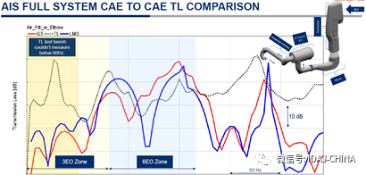 福特针对Stackpipe的结构做了TL计算(单独使用Stackpipe管路进行TL试验),为了确保试验和仿真的可信度,试验经过多次测试,仿真也使用了GT-SUITE和LMS进行,实验结果对比如下:红色为GT仿真结果,蓝色为LMS仿真结果,黑色虚线为测试结果,从对比中可以发现GT和LMS对TL的峰值位置的捕捉基本合理,GT比LMS的精度稍高。