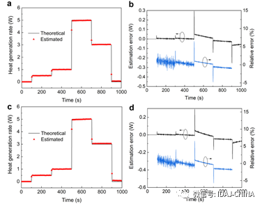 ●快充过充中发热率估算的误差。a图为风冷时发热率对比;c图为水冷时发热率对比;b/d图分别为两种冷却条件下的估算误差
