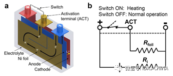 本文作者通过测量一种内部加热电池(见下图)的表面和内部温度,利用简单的两状态传热方程来估算电池发热量。该电池通过在电池内部插入一个薄的镍箔,其一端与负极极耳焊接在一起,另一端伸出电池外部,作为独立的端口。通过控制正极与独立端口之间的开关,就可以实现电池内部加热的控制。