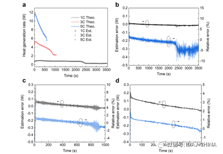 ●快充过程中发热率估算的误差。a图为发热率对比,b/c/d图分别为1C/2C/5C的估算误差