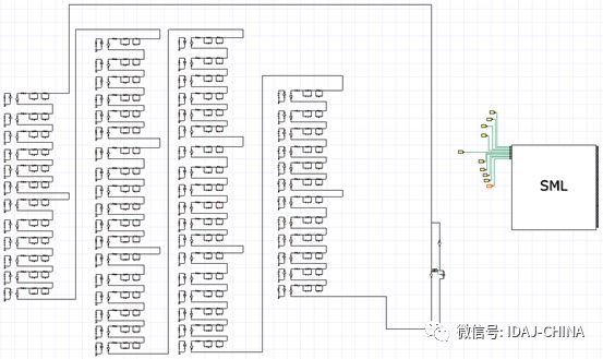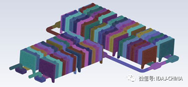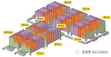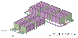 整个电池包及冷却回路的几何模型如下一节中图13所示,电池包由10个模组组成,每个模组中有6个电池单体。电池单体间为串联关系,模组间也是串联关系。单个模组的ECM电路如图11所示,整个电池包的ECM电路如图12所示。