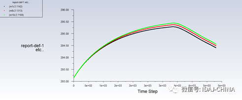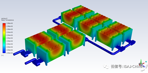 ROM计算结果:模组编号和每个模组上显示温度曲线的中间电芯位置如图22所示,电芯上的平均温度曲线如图23所示。电芯温度都有升高,并且温度相差很小,最高温度约为295.4℃。根据曲线的排列顺序可以看出,冷却回路最末端的模组9和10上的平均温度最高,这是因为冷却液在冷却电芯过程中被加热,温度略有升高,因此冷却回路末端的电芯温度略高。电芯温度最低的是模组1和2,因为冷却液温度最低。模组3-8的下方管路中冷却液流量减少,但温度升高,所以模组3-8的温度居中,分布规律也是冷却液温度较低一侧(模组3和4)的电芯温度低,冷却液温度较高一侧(模组7和8)的电芯温度高。图24为图23中选出模组1,6和10上的电芯温度曲线。