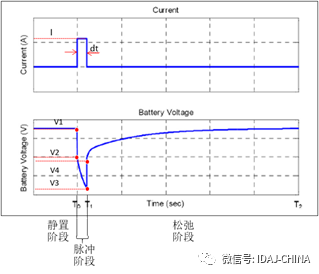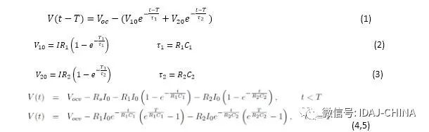 Min Chen提出一种非线性拟合,拟合的表达式为多项式与指数形式的组合[3]。Shugang Jiang提出了一种拟合方式[5],对于RC参数的拟合使用松弛段数据,如图4所示,引自Li的讲义[6]。Voc = V1,Rseries = (V1-V2)/I,R_L,C_L, R_S,C_S 是根据松弛段电压数据用最小二乘法拟合得到的,拟合公式[5]为公式1-3。还有一种非线性的拟合方法Levenberg-Marquardt方法,Voc = V1,其他参数由脉冲段和松弛段的数据拟合得到,拟合公式为Min Chen的ECM电路在脉冲电流下的解析解[6]为公式4,5。拟合后需要对拟合结果进行相应的验证工作。