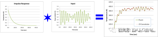 本文用到的降阶模型是LTI ROM(Linear Time Invariant,Reduce Order Model)。当系统是一个线性时不变得系统时,如果两个LTI系统有相同的脉冲响应时,两个系统就是等价的。LTI ROM降阶的数学本质是计算卷积,如17所示。卷积运算利用脉冲响应和输入,然后直接计算输出。不需要几何,网格或其他任何信息。LTI系统由脉冲响应表征。阶跃响应对时间的导数就是脉冲响应,因此LTI系统的输入就完全有阶跃响应表征。卷积运行需要几秒钟,比CFD计算快得多。[7]