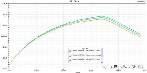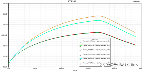 将充电过程中随时间变化的热源,以Profile的形式加载在三维模型上,计算瞬态的温度变化过程。充电结束4800s时刻的电池包温度云图如图26所示,可以看出单个模组上的温度差别。提取模组10上各电芯的平均温度曲线,如图27所示,对比ROM计算结果图25,结果非常吻合
