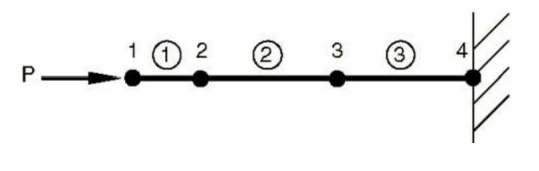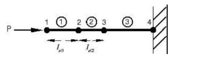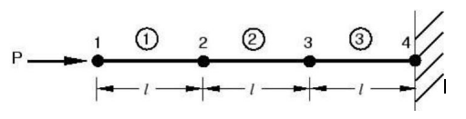 考虑应力波沿用三个单元建模的杆的传播,如图所示。我们将研究杆的状态,因为 我们随着时间的推移而增加。 图1- 4具有集中载荷的杆的初始配置, P 在自由端。