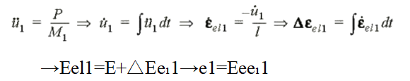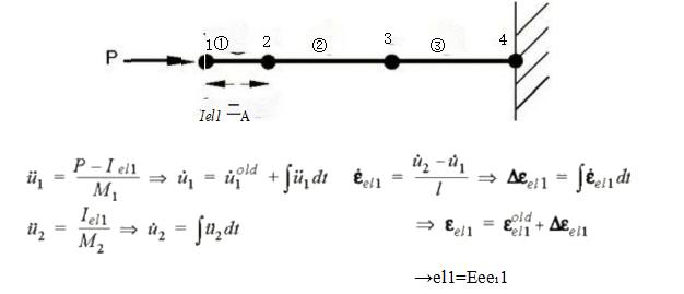 在第一次增量中,节点1具有加速度,ü1作为集中力P 的结果,施加到它身上。加速度使节点1具有 速 度 ,u₁ 而速度又会导致单元1中的应变率el1 。 单元1中的应变增量是通过对应变△ εel₁1速率在增量 1的时间进行积分而获得的。总应变是Ee11初始应变和应变增量之E0和。在这种情况下,初始应变为 零。计算单元应变后,通过应用材料本构模型获得单元应力σel1。对于线弹性材料,应力只是弹性模 量乘以总应变。此过程如图 1-5所示。节点2和3不会以第一个增量移动,因为没有对它们施加任何 力。