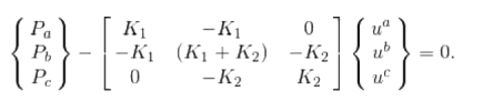 通常,元素刚度 (EA/L 项)可能因元素而异;因此,将图元刚度写为K₁ 模型中K₂ 的两个图元。我们 有兴趣获得平衡方程的解,其中外部施加的力P 与内部产生的力I处于平衡状态。当参考收敛性和非线 性讨论这个方程时,我们将其写为 {P}-{I}=0. 因此,对于完整的双元素、三节点结构,我们修改符号并将平衡方程重写为