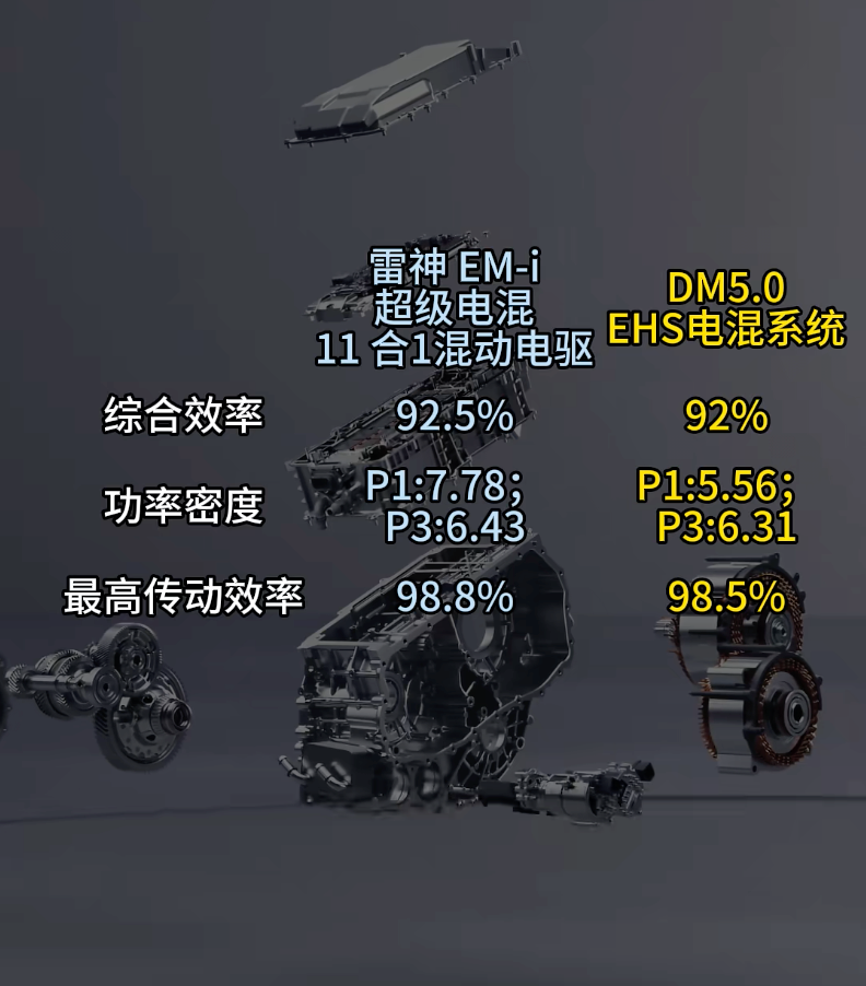 首先从系统结构上来讲,EM-i采用的是P1+P3的串并联架构,配合一套单挡的电驱动的变速箱。这套系统可以实现在不同速度和负载的这种工况下灵活的切换档位,既保证了加速性,也兼顾了高速续航时的这种经济性。相对而言,DM-i的架构更为简单,它采用的是单电机的EHS系统,并不带传统意义上的这种变速箱,而是通过电控系统智能调配动力的输出,实现尽可能多的用电形式,结构简单,响应迅速是它的特点。