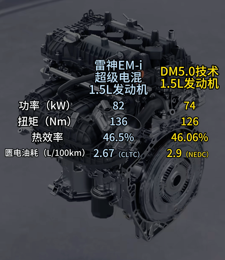 DM 5.0发布时,比亚迪宣称其发动机热效率达到了46.06%,吉利立马就甩出了一张46.1%的中汽研认证证书,说自己才是最高的。最终,吉利将一款热效率达到46.5%的发动机量产,并应用在了全新混动系统EM-i上。