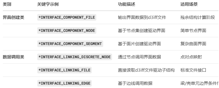 子结构调用:在子结构分析中通过*INTERFACE_LINKING_FILE读取d3iff实现边界条件映射