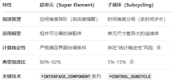 常与超单元混淆的子循环技术(*CONTROL_SUBCYCLE)本质是时间步长分级策略,二者区别如下: