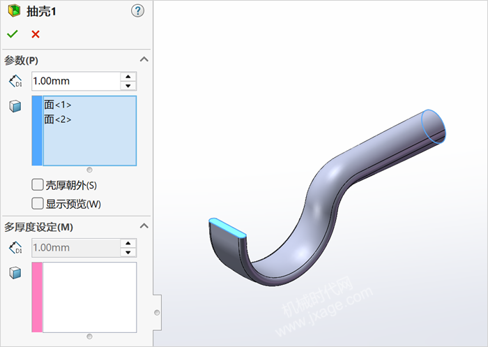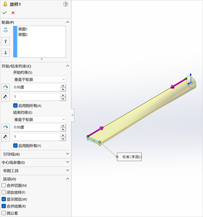 4.点击“放样凸台/基体”,选择下图所示的2个草图作为轮廓。开始/结束约束如下图所示,均设置为“垂直于轮廓”,其他设置如下所示,点击勾号完成。