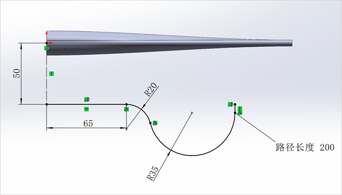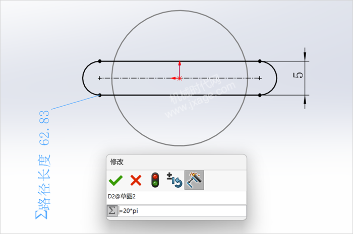 3.点击“草图绘制”,在基准面1上绘制如下图所示的草图,注意整个曲线长度和步骤1创建的圆周长一致,即20*pi,点击勾号完成草图的绘制,。