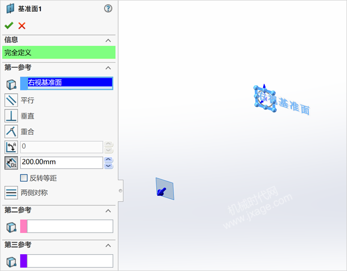 2.创建基准面1,以右视基准面为基准,偏移200mm。
