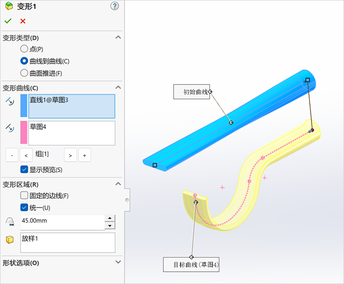 7.点击“插入”-“特征”-“变形”,变形类型选择“曲线到曲线”,初始曲线选择草图3,目标曲线选择草图4,其他设置如下图所示。