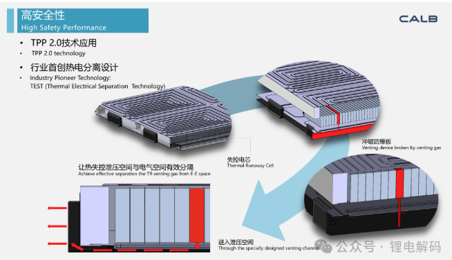 中创新航采用 TPP 2.0 技术,使电芯泄压方向沿高度(Z 向)进行,而高压电路布置在电池两侧,形成 “泄压区与电路区” 的平面分离。同时,电池包内设置独立泄压空间,确保高温气体、导电物质与强电系统完全隔离,避免交联风险。不过其具体电芯结构细节尚未公开。