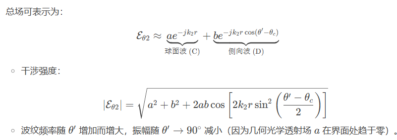 这些二阶场分量在界面处形成 驻波(standing wave),导致场强随距离按 ρ^−2 衰减(而非几何光学场的 r^−1 ),因此辐射模式在界面处出现“锐减”。
