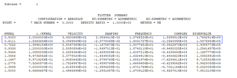 颤振点出现在(KFREQ, 速度) =(0.5, 3.430E+02) 和(KFREQ, 速度) =(0.6111, 3.087E+02) 之间。