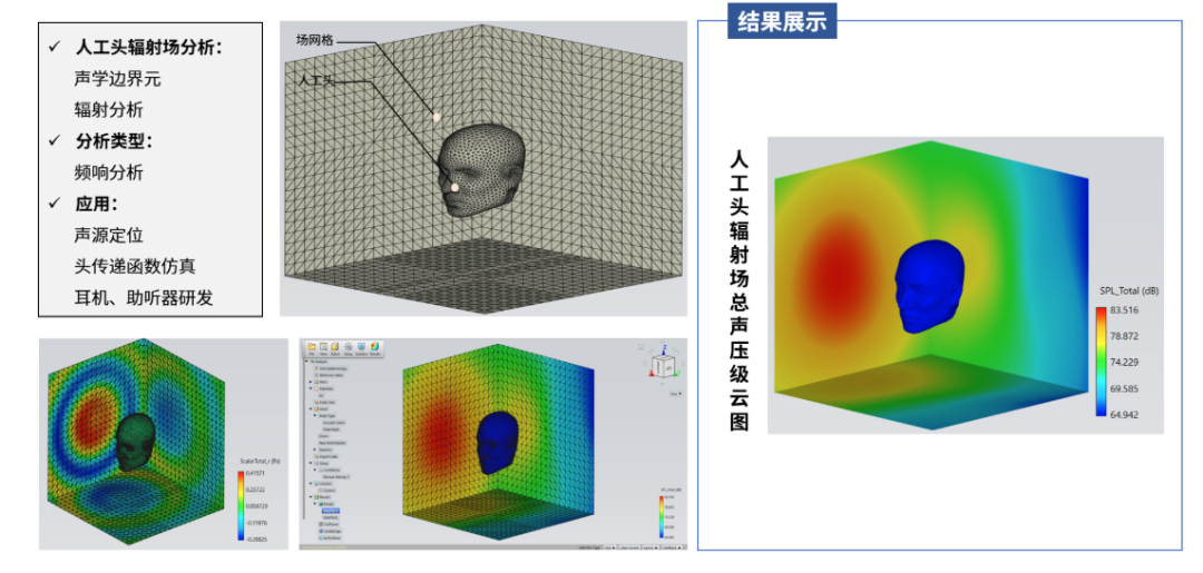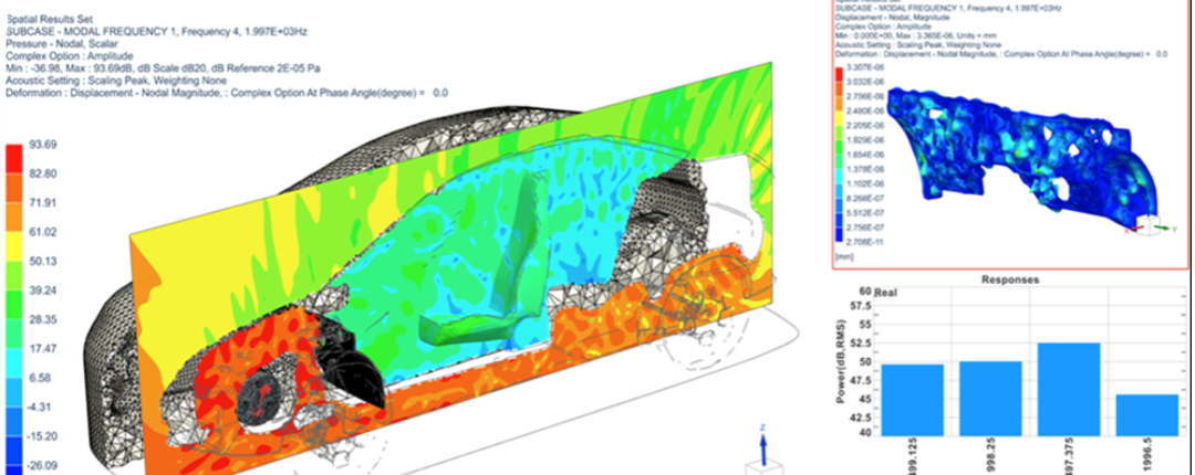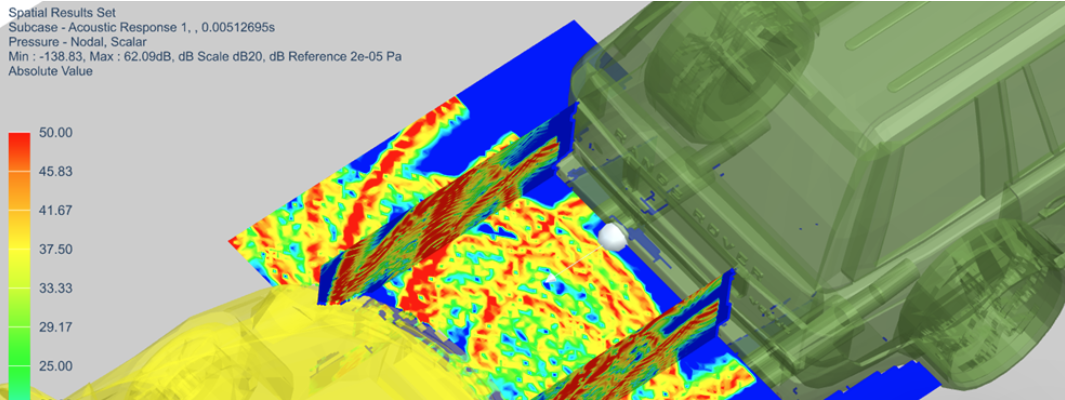 - • 核心优势: Simcenter Acoustics(前LMS Virtual.Lab Acoustics)最大的特点是集成化。它深度整合在Simcenter 3D平台中,可以实现从CAD、结构分析到声学分析的全流程仿真。其求解器覆盖有限元(FEM)、边界元(BEM)、射线声学以及统计能量法(SEA),能够应对从低频到高频的全频段声学问题。与测试部门的Simcenter Testlab联动是其另一大杀手锏。