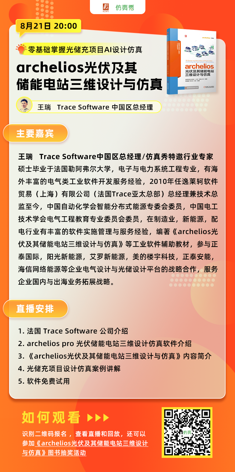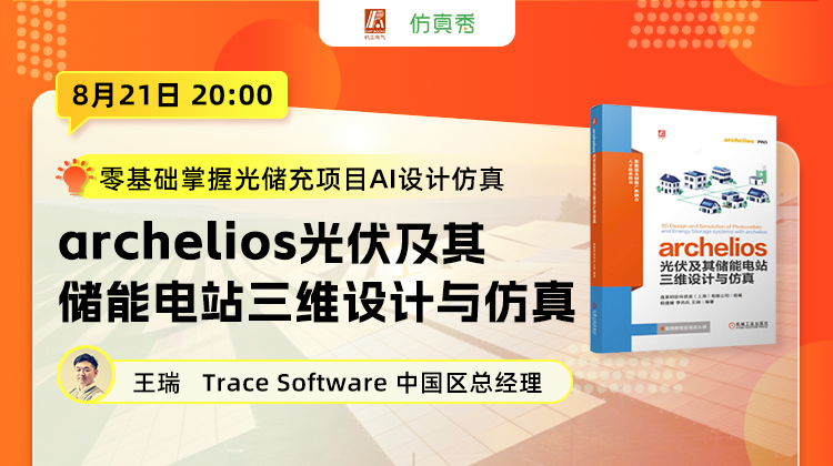 2025年8月21日20时,我们邀请《archelios光伏及其储能电站三维设计与仿真》图书作者,Trace Software 中国区总经理,仿真秀特邀行业专家王瑞老师做《零基础光储充项目AI设计仿真:archelios光伏及其储能电站三维设计与仿真》线上讲座,支持反复回看。以下是具体安排: